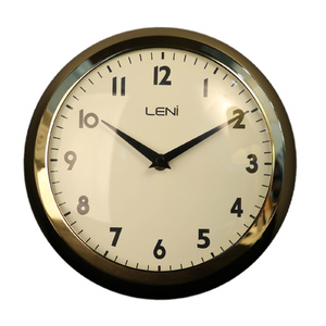 This traditional School style wall clock from Leni makes a great teaching aid for kids to learn how to tell the time. Ideal for the home, office or school. Sturdy, gold metal case measuring 23cm and glass face cover with black numbers and step clock hands. This clock is also available in black, red and metallic copper and brushed nickel colours in our store